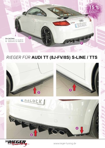 2 Orig. Audi Felgen VA: 9,0x20 ET52 mit 255/30-20 HA: 9,0x20 ET52 mit 255/30-20 5 RIEGER FÜR AUDI TT (8J-FV/8S) S-LINE / TTS 2 3 4 6 www.rieger-tuning.de