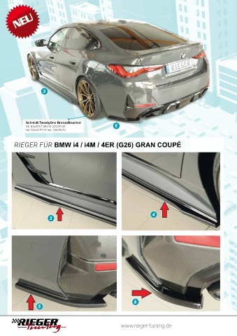 3 Schmidt TwentyOne BronzeBrushed VA 8,5x20 ET 28 mit 225/35-20 5 HA 9,5x20 ET 37 mit 255/30-20 RIEGER FÜR BMW i4 / i4M / 4ER (G26) GRAN COUPÉ 4 3 6 5 www.rieger-tuning.de