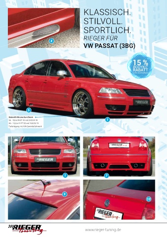 KLASSISCH. STILVOLL. SPORTLICH. RIEGER FÜR 4 VW PASSAT (3BG) 5 Schmidt VN-Line Dur-Chrom VA 9,0Jx19 ET 35 mit 235/35-19 1 HA 10,0Jx19 ET 35 mit 265/30-19 Tieferlegung mit KW-Gewindefahrwerk 1 7 9 10 www.rieger-tuning.de